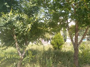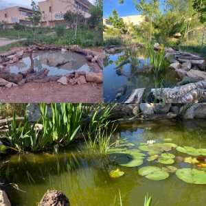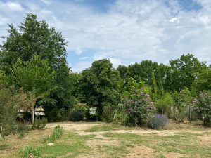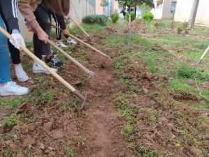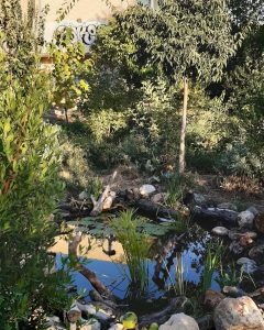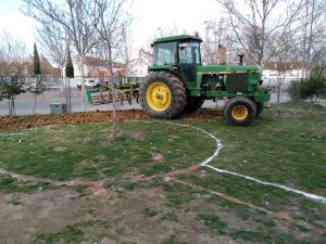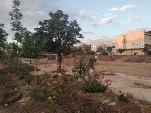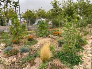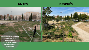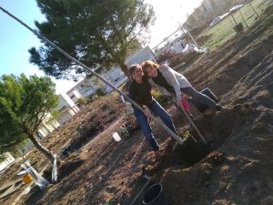 Confinamiento mediante, en tan solo 30 días levantamos el suelo compactado y muerto de sus 4.000m2 de patio con maquinaria prestada de una empresa local, rellenamos el suelo de materia orgánica: estiércol y paja de un vecino ganadero, restos de poda municipales… plantamos cada cm con más de 250 árboles y cientos de especies herbáceas y arbustivas, combinando a través del diseño agroecológico tanto especies autóctonas como productivas y comestibles.